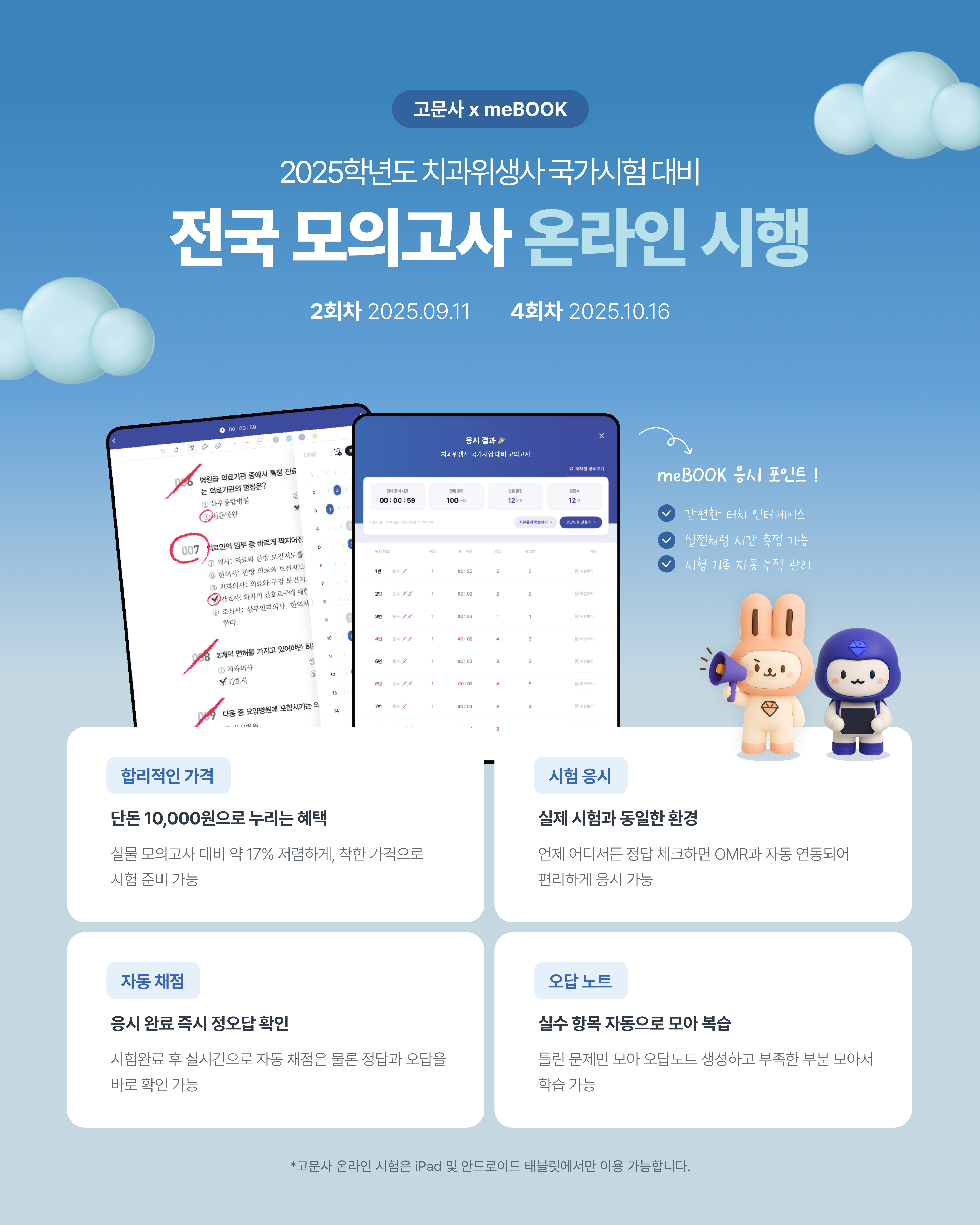 <모의고사 이벤트 당첨자 발표> 안녕하십니까 고문사입니다.고문사 2023년 모의고사 2회차 이벤트 당첨자는 다음과 같습니다. 선문대 백석대 영산대 여주대 유원대 수성대 전남과학대 경북전문대 건양대 전북과학대 전주기전대 마산대 강릉원주대 대전보건대 대원대 전주비전대 동의대 서영대(파주) 진주보건대 초당대 백석문화대 광주여대 동남보건대 대전과기대 신성대 충청대 수원과학대 춘해보건대 혜전대 삼육보건대 대구과학대 이벤트 상품인 고문사 요약집은 각 학교로 발송 예정입니다.다시 한번 고문사 모의고사를 이용해 주셔서 감사드립니다.전국 치위생학과 학생들의 2023년 국가시험 합격을 진심으로 응원합니다. 감사합니다 :)